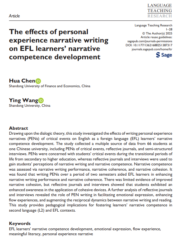 近日,亚洲体育博彩平台 陈华教授在语言学领域知名国际期刊Language Teaching Research发表题为“The effects of personal experience narrative writing on EFL learners’ narrative competence development”的学术论文。陈华教授为第一作者,山东大学王颖教授为通讯作者。Language Teaching Research系SSCI一区期刊、中科院一区TOP期刊;JIF排名:21/306,2024年影响因子:3.8,近五年影响因子:5.3,属于我校A1类期刊。