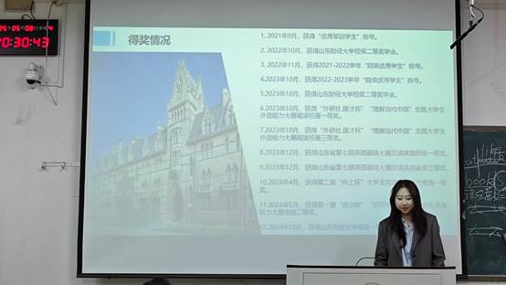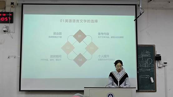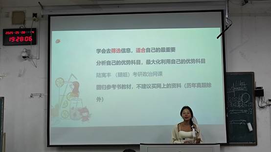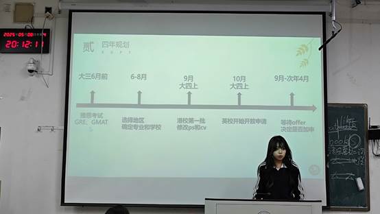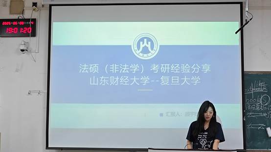 于5月8日晚在山东财经大学舜耕校区成功举办2025年考研经验分享会。2021级考研以及出国(境)申请成功的优秀学生代表受邀出席本次活动,为百余名学子提供精准指导。2023级英语四班孙琛同学担任本次活动主持。
